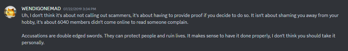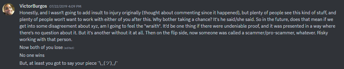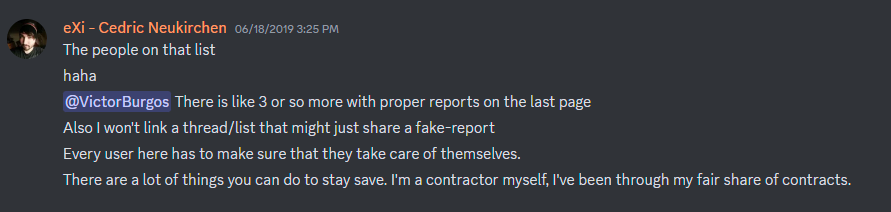 I also created the CRB as a special means to properly verify reports submitted to the server, and if proven valid, I greenlight and sponsor them on a special channel for verified reports. This is to filter the frivolous reports that some users made back when the SRT thread existed. For good measure to ensure the rules or laws are not violated, we prohibit any extreme means like doxxing (ie. posting someones SSN or address) on the server. You can still post their national location and city (ie. Worcester, MA, USA) as it is necessary to know where the crook is located and gives and idea of what kind of person they are – a US American in this case. We only allow information that will not put anyone in unnecessary harm (which is against Discord TOS anyway) and any submitted reports that do will consequently be removed. Granted and admittingly, I could not care less what the opposing parties do outside of CRB; if they want to play a final game of deathmatch IRL and kill each other somewhere in a fight club in Mexico, just keep it away from CRB. We are not responsible for any of that. We are not the Internet Police. All we want is to help those who are being defrauded and are losing hope in making an honest living doing what they love – making video games.