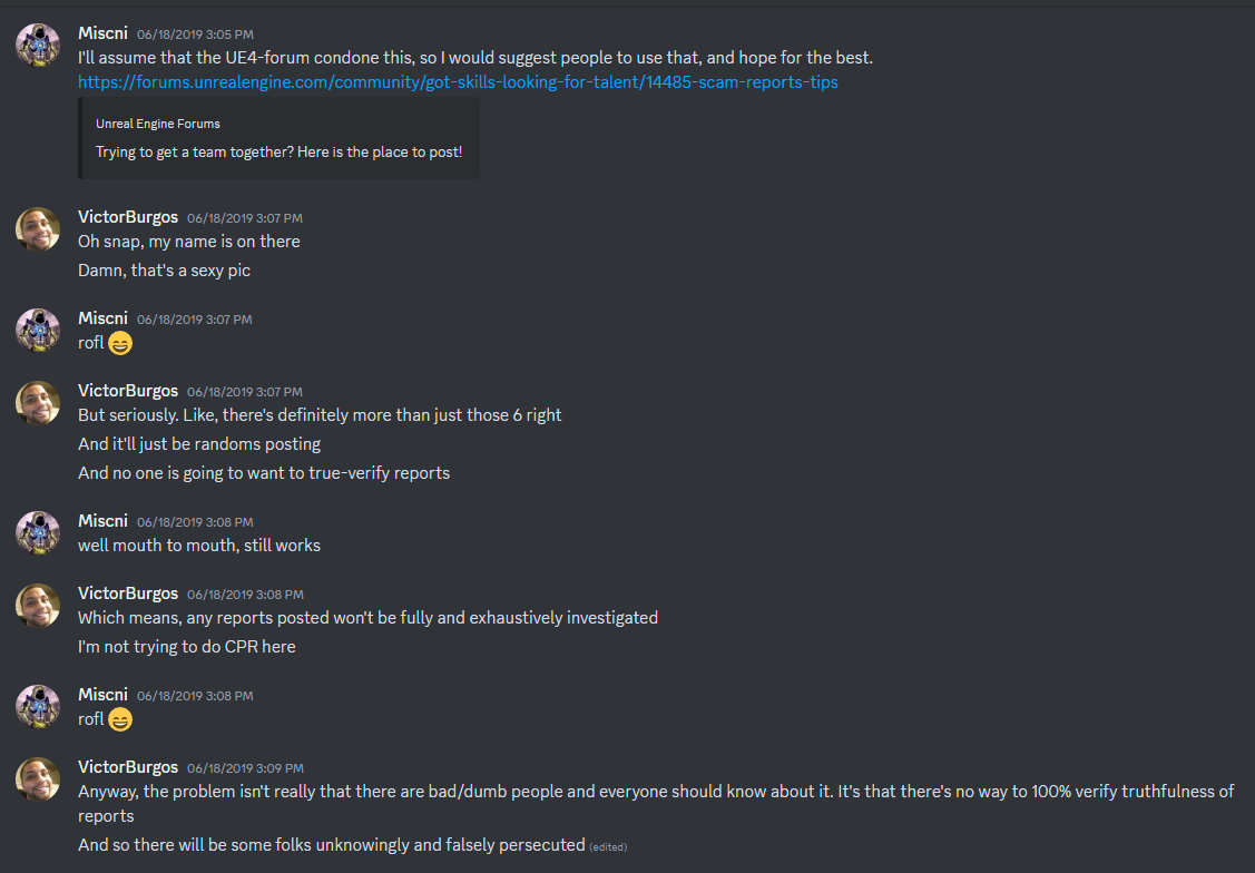 The most important thread for any freelancer seeking to make an honest living from game development, first created by Michael Philips, a fellow UDK veteran and a seasoned Grand Theft Auto: San Andreas modder, whom like myself was fed up with the scammers that were riddling the Unreal Engine community looking to prey on particularly new game dev talent or new game dev projects with ample funding and/or resources. You were once able to post your report of the scammer and the incident on the thread to warn others of said scammer and help them protect themselves against them accordingly. It was working VERY well for years until UE4 and what would ultimately become Epic Game’s “unofficial” (news flash: they’re lying; it is OFFICIAL without a doubt) embarrassment of a Discord community, Unreal Slackers became a thing.